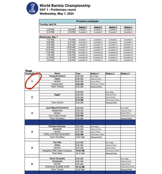 The schedule for the World Barista Championship 2024 🇰🇷 Preliminary Round has been announced. The competition starts at 9:00 AM on May 1st (Wednesday)!